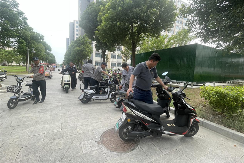 随后,各支部党员分别带领物业、保安、校卫队、八一社开展校园电动车规范摆放活动。烈日炎炎,大家热情丝毫不减。党员同志以身作则,率先垂范,积极带领大家对学生公寓周边电动车乱停乱放、堵塞消防通道等现象进行了集中清理。