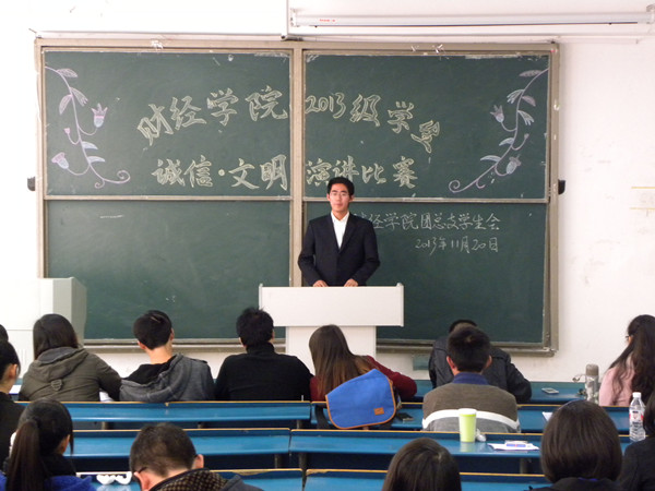 11月20日下午,财经学院在新A102举办了2013级学生“诚信·文明”演讲比赛。出席的评委有院学生会主席梅毅、院社联副主席杨立志、院学生会文艺部部长孙凯伦、宣传部部长李梦洋、生活部部长王驰、保卫部部长褚彩华以及创新部部长罗娜。团总支辅导员薛枫到场观看比赛。