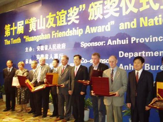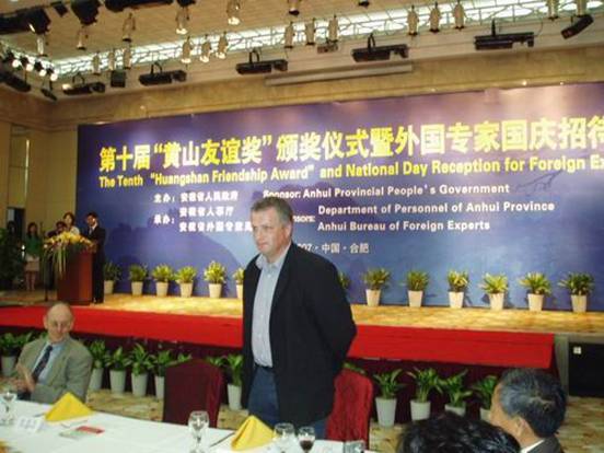2007年9月29日晚,安徽省人民政府在合肥索菲特明珠国际大酒店举办第十届“黄山友谊奖”颁奖仪式暨外国专家国庆招待会。本次颁奖仪式和招待会由省人事厅和省外国专家局承办,威尼斯官网外事办副主任张严政、爱尔兰籍教师Gregory、美国教师Chuck•David和来自全省各地的近200名外国专家代表,以及省人事厅、省教育厅和省、市外办、外国专家局的负责同志参加了颁奖仪式和招待会。威尼斯官网教师Gregory由于教学工作上的突出表现,被省人民政府授予第十届“黄山友谊奖”(全省仅9人获此殊荣)。