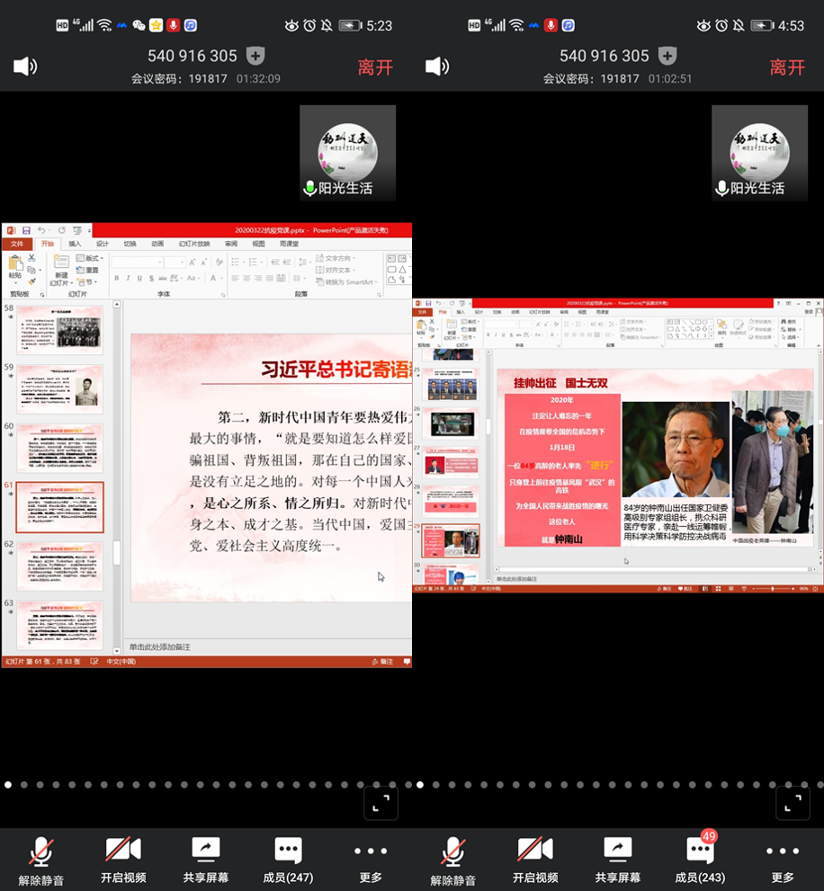 党课从“14亿中国人的战疫之路”视频开启,张程结合当前国家和世界范围内的抗疫形式,从“在战‘疫’中正确认识世界和中国发展大势、读懂百年‘大变局’”、“在战‘疫’中正确认识中国特色和国际比较、坚定信仰‘主心骨’”、“在战‘疫’中正确认识时代责任和历史使命、把准价值‘定盘星’”、“在战‘疫’中正确认识远大抱负和脚踏实地、汇聚成长‘卡路里’”四个方面与同学们进行了分享,号召广大青年学子坚定理想信念,在磨难中成长,在学习生活中踏实学习、勇于创新,肩负起建设美丽中国、实现中华民族伟大复兴中国梦的历史重任。