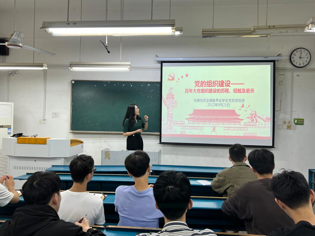 为进一步巩固党史学习教育成果,发挥党支部战斗堡垒作用和党员先锋模范作用,激励支部党员在新时代中建功立业,2022年9月21日,机械工程学院车辆与农业装备专业学生党支部在求知楼B104开展了以“党的组织建设”为主题的第三季度党课,党课由党支部书记谭博文主讲。