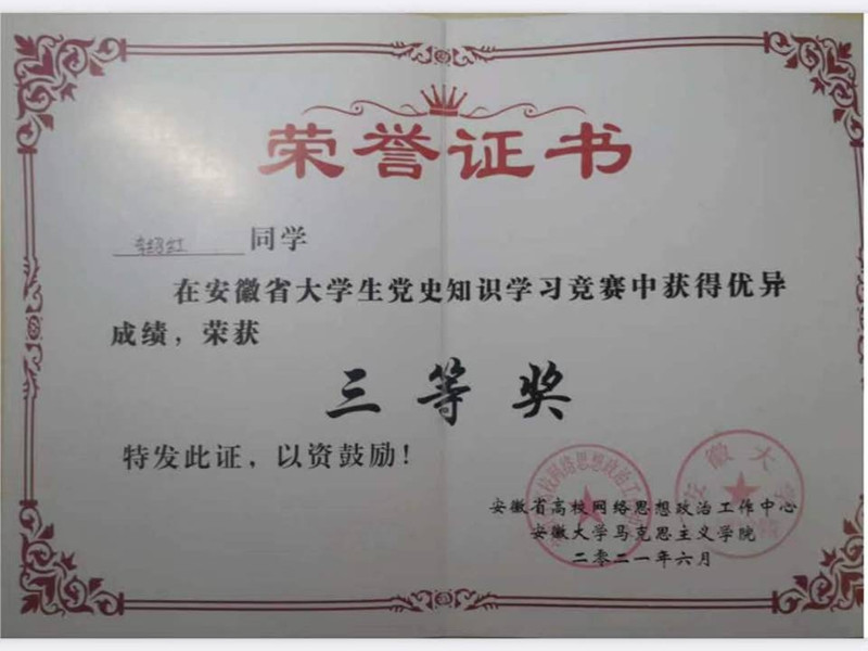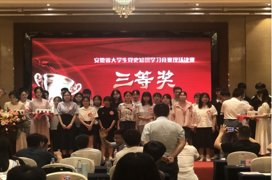 为庆祝中国共产党成立100周年,认真学习贯彻习近平总书记在党史学习教育动员大会上的重要讲话精神,汲取党史营养和力量,按照学史明理、学史增信、学史崇德、学史力行,引导广大学生党员增强“四个意识”、坚定“四个自信”、做到“两个维护”,引导全体大学生传承红色基因、坚定理想信念。安徽省高校网络思想政治工作中心、安徽大学马克思主义学院开展全省大学生党史知识学习竞赛的决赛于2021年6月27日在合肥丰大国际大酒店举行。威尼斯官网财经学院财务管理193班李绍红同学入围现场决赛,马克思主义学院戴婧佼老师作为指导教师,带队参加比赛。