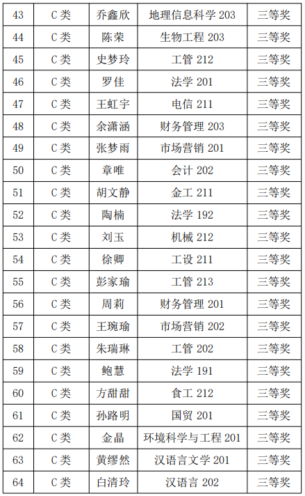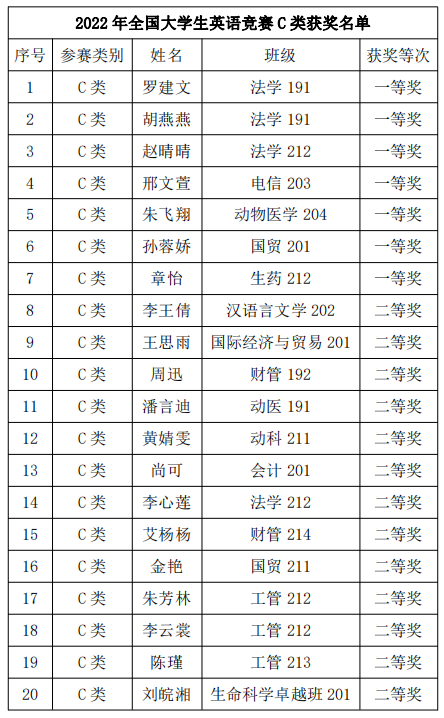 “2022年全国大学生英语竞赛”初赛于5月15日上午在威尼斯官网举行。本次竞赛共有1329人报名参赛,其中B类206人、C类1123人。在教务处细心指导和外国语学院精心组织下,在阅卷老师客观公正的认真评阅后,严格按照学生成绩和本次竞赛给定获奖比例划定学生获奖名单,并报教务处批准,现公布获奖名单如下: