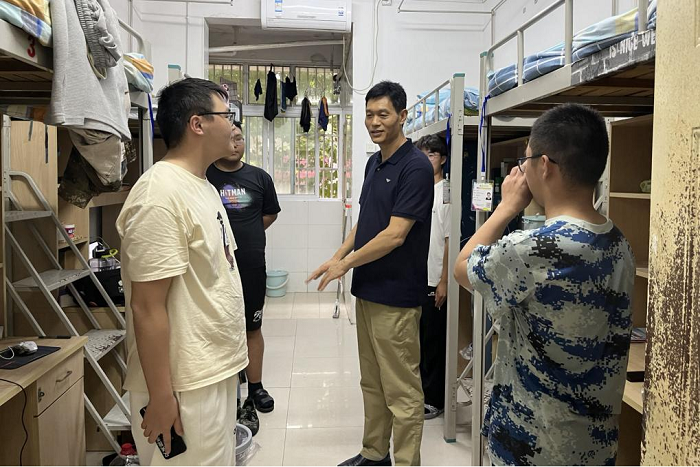 “同学们在宿舍住起来可习惯?”“从黑龙江过来安徽这边可还适应?”在学院党委书记付光玺的一句句关怀中,同学们也敞开心扉与老师们聊起天来,简单介绍了自身情况和入学感受,气氛轻松融洽。走到烹饪与营养教育专业宿舍,同学们笔直坐在小方凳上,或专注学习英语单词,或认真学习学院规章制度,见到老师们的到来,纷纷起立问好。付光玺对同学们展示出的良好精神风貌表示充分肯定,他强调,宿舍是同学们生活的主要场所,大家要团结一心、和睦相处、互帮互助,严格遵守学校学院各项规章制度,营造爱生活、爱学习的良好氛围;各班级辅导员要多多交流,互相学习借鉴好的经验做法,切实发挥辅导员AB岗的作用,同管理、同负责,坚持每周辅导员例会“三进”工作汇报机制,持续发扬优良工作传统,推动学院学生工作上水平、上台阶。
