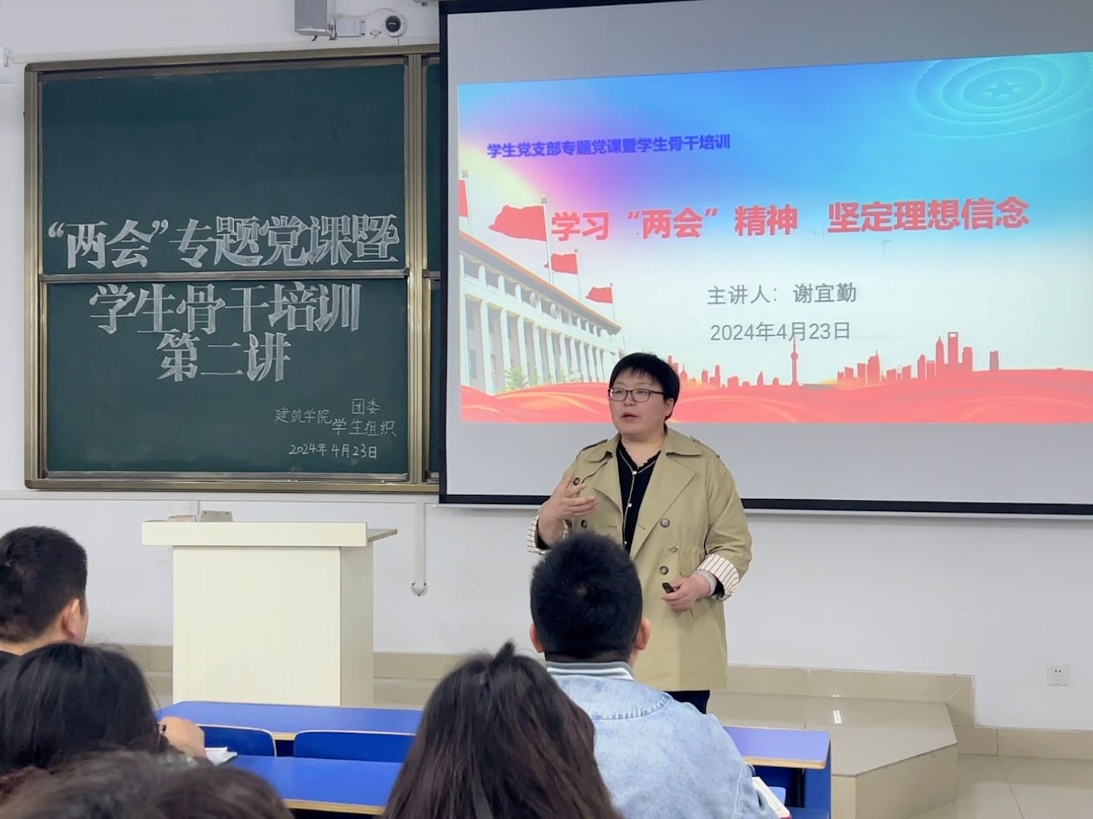 为深入学习贯彻全国“两会”精神,提高大学生政治能力与素养,4月23日晚,建筑学院在尚行楼C202举办了以“学习‘两会'精神 坚定理想信念”为主题的专题党课暨学生骨干培训教育讲座。讲座由学院党委副书记、纪委书记谢宜勤主讲,城乡规划专业学生党支部、土木工程专业学生党支部党员和团学组织成员参加,讲座由辅导员武辉主持。