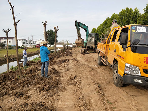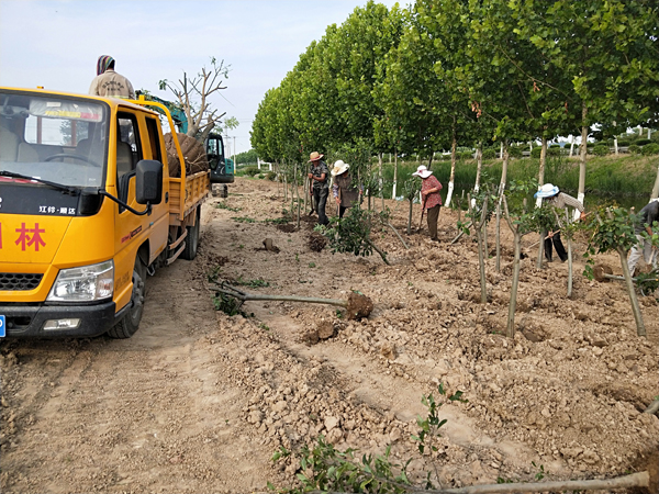经了解,施工前要进行放样。根据施工图上2m*2m的紫色正方格,确定树木的位置,并用白石灰定点现场相应的位置。种植穴的大小依土球规格情况而定,其中坑的深度应比土球高度深10-20cm。在苗木的装车、运输、卸车等各项工序中,应保证树木的树冠、根系、土球完好。土球直径超过60cm的树苗,要辅助种植,并在运输前用油锯锯掉枝头,减少苗木水分蒸发,从而保证成活率。