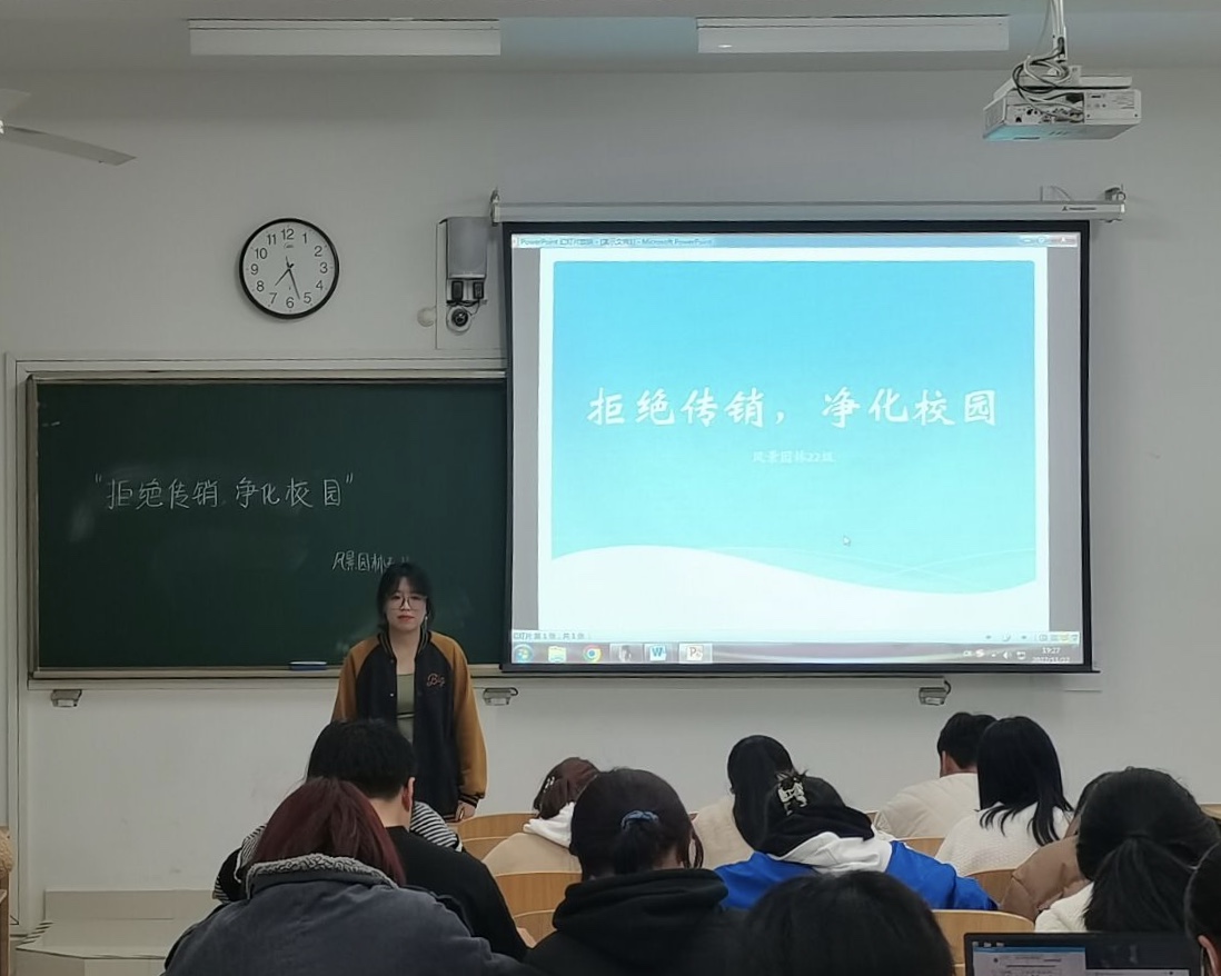 为进一步增强在校大学生自觉抵制传销的意识和能力,进一步提高学生识别防范传销的能力,营造抵制传销的良好校园氛围。近期,建筑学院组织各班级开展了“拒绝传销,净化校园”的主题班会。