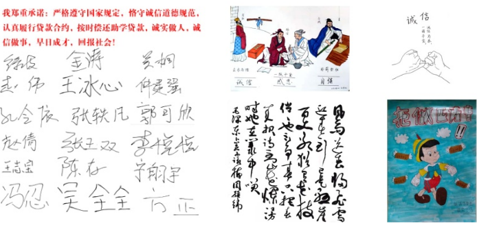 活动主要包括:“诚信还贷”线上签名墙、“感恩奉献”征文比赛、“至诚则成,立信于行”诚信教育视频初赛、诚信资助主题教育宣传作品展、资助政策两节课等活动。活动共收集到征文67篇、诚信教育视频14个、宣传作品26幅。