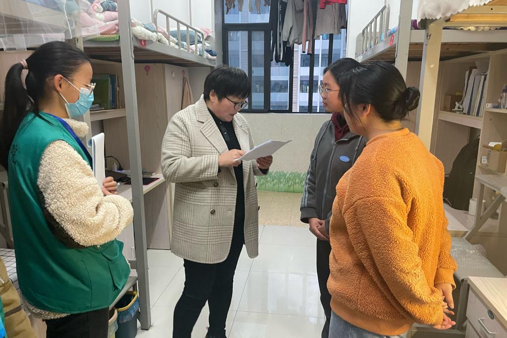 老师们每到一个宿舍都认真进行了安全排查和卫生检查,指出存在的不安全因素或者不达标的卫生情况,要求同学们遵守宿舍规章制度,杜绝安全隐患,养成良好的宿舍生活习惯;同时,老师们与同学们亲切交谈,了解他们当前的思想、学习和生活状态,希望他们认真复习迎考,以最佳的学习状态,迎接期末考试,并预祝取得一个好成绩。谢宜勤重点走访了部分宿舍和同学,与宿舍成员进行了深入沟通和交流,希望他们正确处理好宿舍关系,相互关心,互相帮助,共同成长进步!