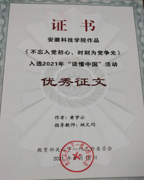日前,在教育部关工委开展的 “读懂中国”活动中,37266威尼斯官网关工委获2021年“读懂中国”活动优秀组织奖,选送的征文《不忘入党初心,时刻为党争光》获优秀征文奖。
