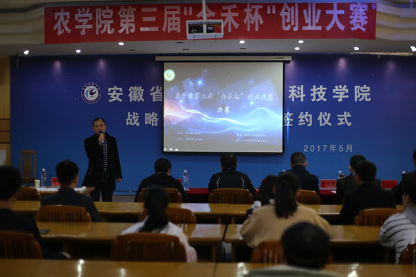 2019年3月30日下午,农学院第三届"金禾杯"创业大赛在老图书馆2楼报告厅隆重举办。安徽万绿生态休闲度假有限公司法人代表、执行董事兼经理张坤,建筑学院党总支秘书耿广汉,校党委(校长)办公室秘书李吉庆,化学与材料学院党总支秘书兼分团委书记张炎,农学院正科级辅导员姚祎应邀担任比赛评委。创新创业教育学院院长杨仕勇、农学院党总支书记何世潮应邀出席并指导。