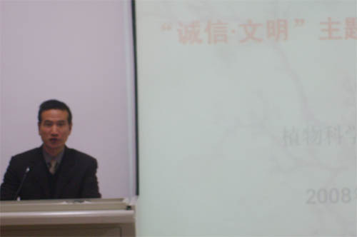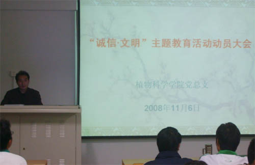 2008年11月6日晚,植物科学学院在学知楼多媒体7教室召开2008级新生“诚信文明”主题教育活动动员大会。参加会议有学院党总支领导、团总支老师、辅导员、新生班级班主任和新生班级全体学生干部。会议由团总支书记张盛主持,团总支副书记沈树周宣读《植物科学学院2008级新生“诚信文明”主题教育活动实施方案》,学院党总支副书记胡明作动员讲话。