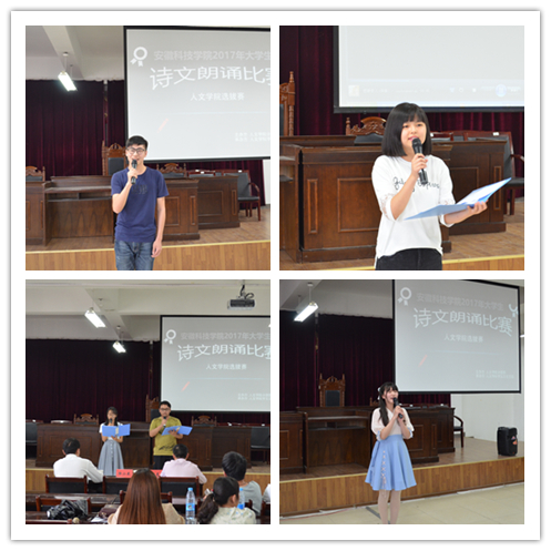 5月8日下午,人文学院在模拟法庭举办校2017年大学生诗文朗诵比赛初赛。汉语言文学专业教研室主任陆山花及教研室教师郭晨春、和建伟担任比赛评委。比赛由人文学院学生会主席田月月主持。