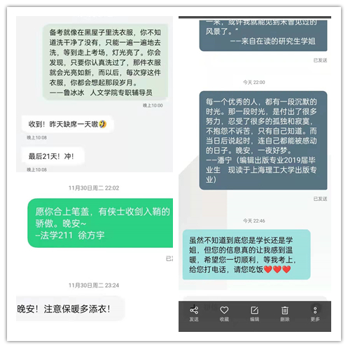 11月25日起,人文学院易班工作站发起“晚安计划”,工作站成员为学院考研学生每晚定时发送晚安短信,缓解考研学生最后一个月的焦虑情绪。短信内容来源于学院师生、后勤工作人员以及毕业学生,目前共计发送晚安短信3000余条。