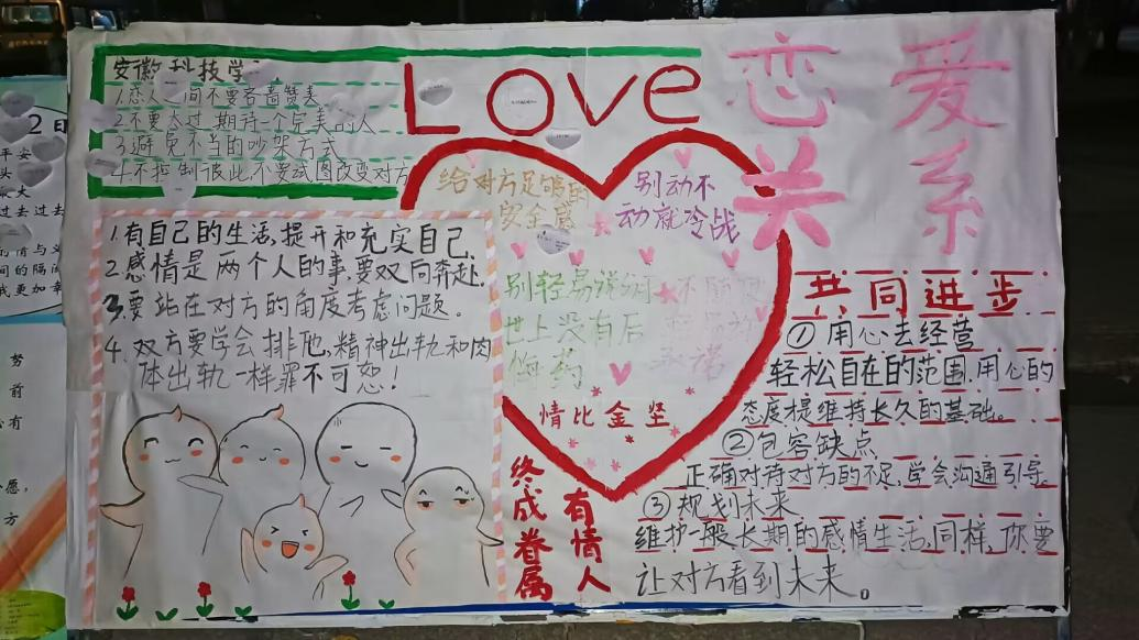 开展线下学习宣传活动,体验式交互交流。学院心理健康联合会通过手绘展板,从如何正确认识恋爱、如何处理恋爱关系等方面展开宣传,引导新生形成正确的感情观,营造了积极向上的活动氛围。
