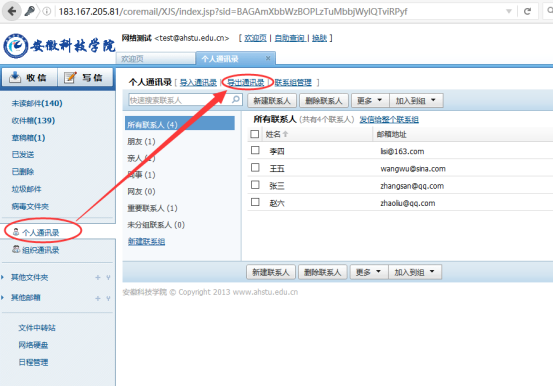 2.进入新邮箱http://mail.ahstu.edu.cn,在通讯录-->个人地址本-->工具-->导入联系人