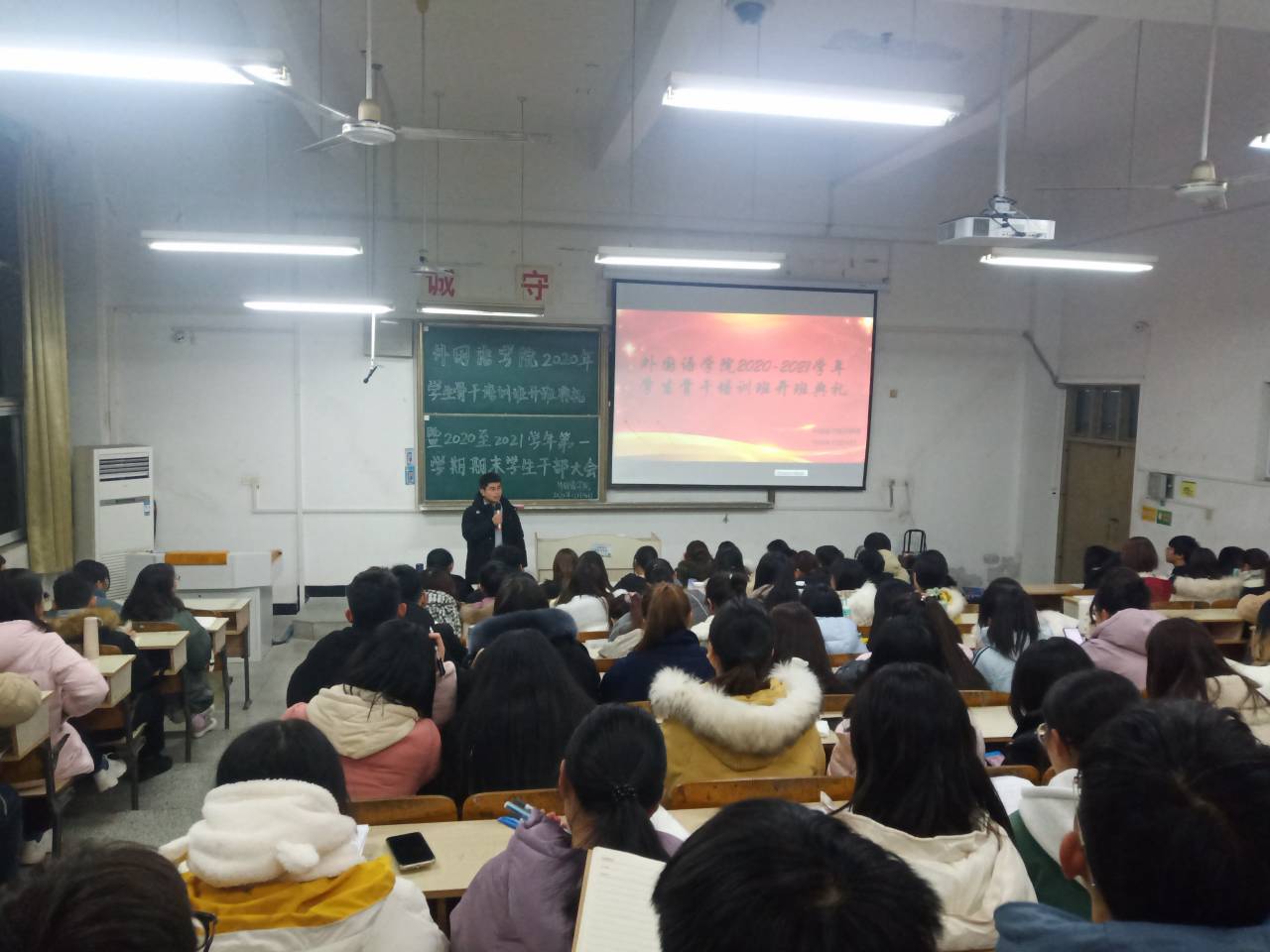 为提升学生干部综合素质,增强学生干部的服务意识,展现新一代青年“不怕苦、不畏难”的精神,进一步加强本院学生干部队伍建设,更好地展现学生干部的能力和风采,外国语学院于12月18日晚上在求知楼A座105教室举行2020年学生骨干培训班开班典礼。外国语学院党总支书记蔡为青、分团委书记陈慧中、专职辅导员宋兵兵出席此次会议。学院分团委全体成员、学生会部长级以上成员、易班工作站部长级以上成员、18-20级各班级主要班委参加。此次开班典礼由宋兵兵主持。