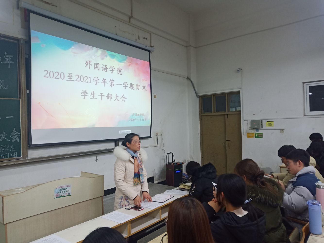 为总结本学期工作成效,安排新学期学生工作的任务,外国语学院于12月18日晚在求知楼A座105教室举办2020至2021学年第一学期期末学生干部大会。外国语学院党总支书记蔡为青、分团委书记陈慧中、专职辅导员宋兵兵出席此次会议。学院分团委全体成员、学生会部长级以上成员、易班工作站部长级以上成员、各班级主要班委参会,此次大会由宋兵兵主持。