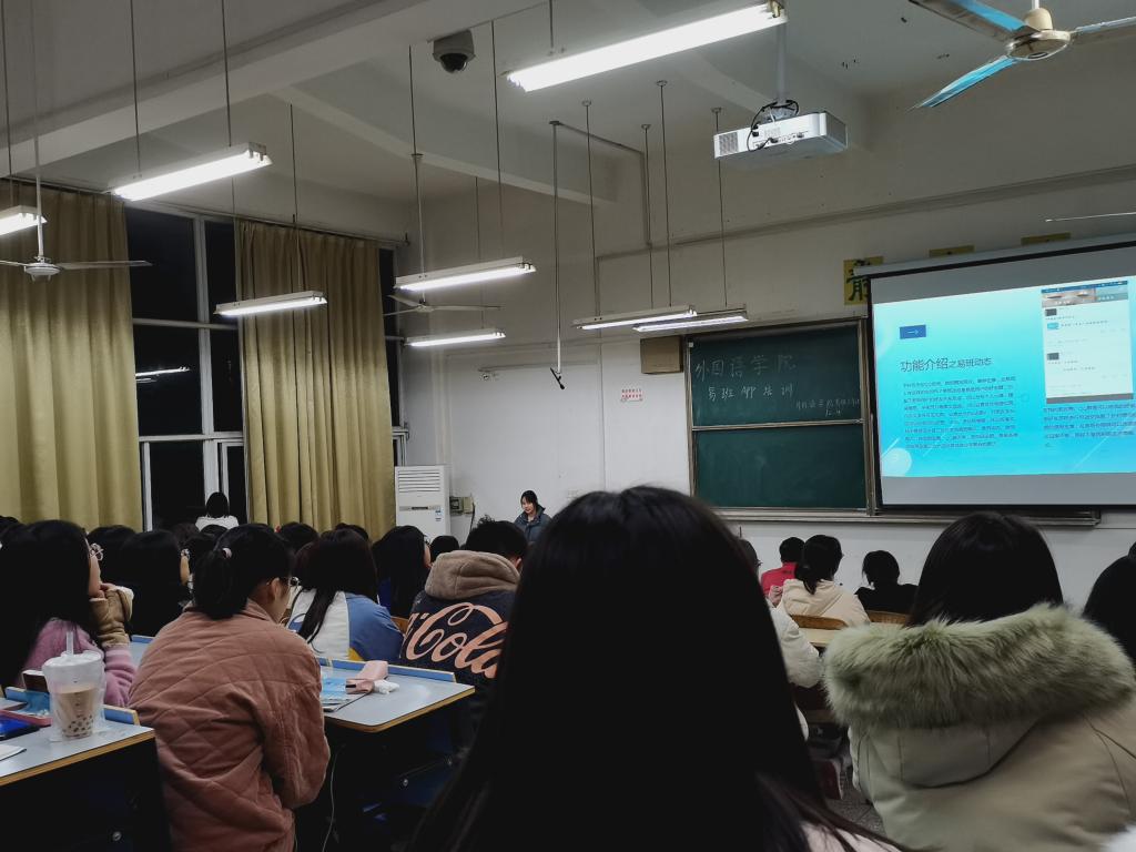 12月23日晚,外国语学院在求知楼A106举行了骨干培训第二讲之易班技能培训会。本次培训由外国语学院易班工作站站长欧阳文静同学主讲,学院2020年学生骨干培训班全体同学参加。