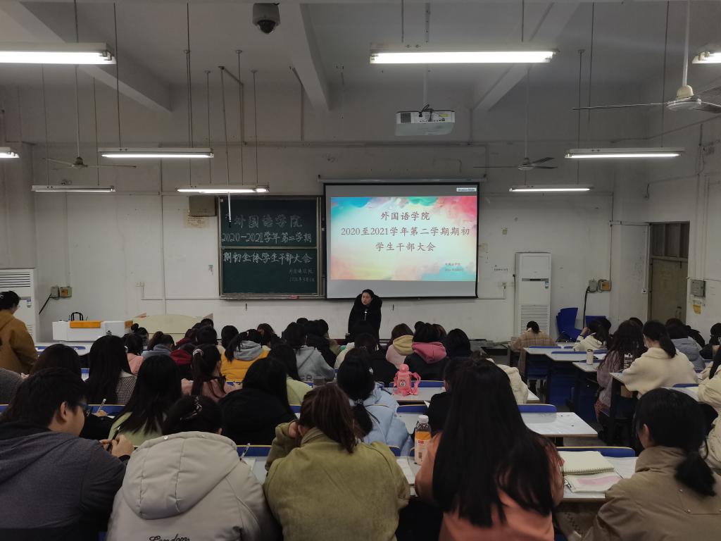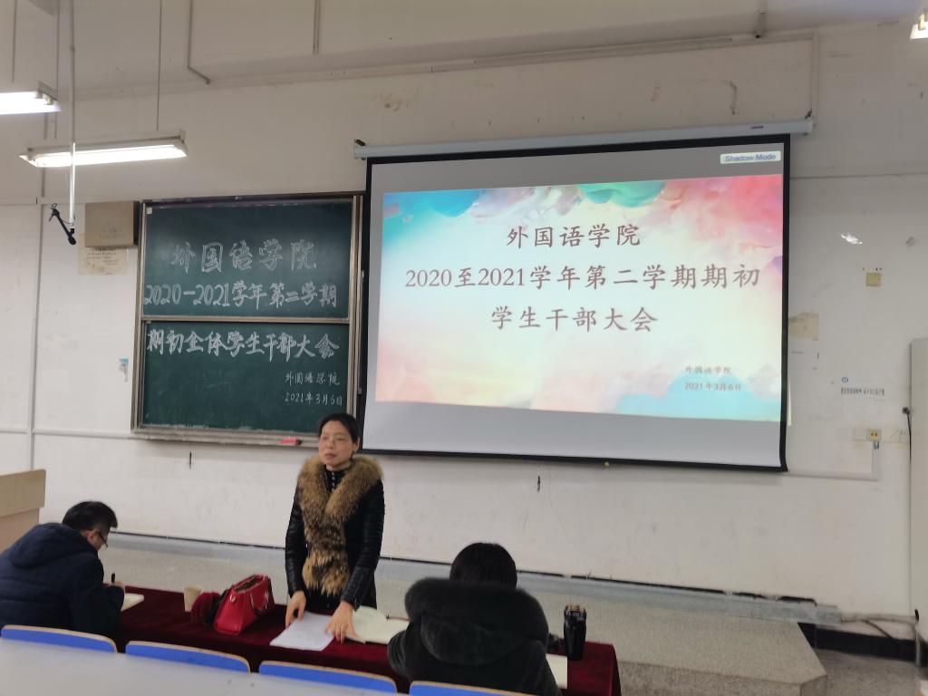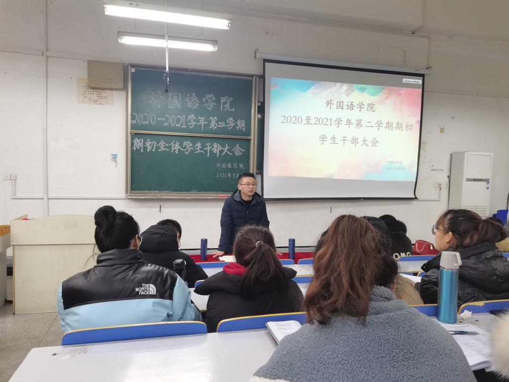 3月6日下午,外国语学院在求知楼A106教室召开学期初全体学生干部大会。会议由外国语学院党总支书记蔡为青主持,学院党总支副书记张海亮、党政办主任陈慧中、专职辅导员宋兵兵出席会议,学院分团委、学生会、易班工作站以及各班级主要学生干部参加会议。