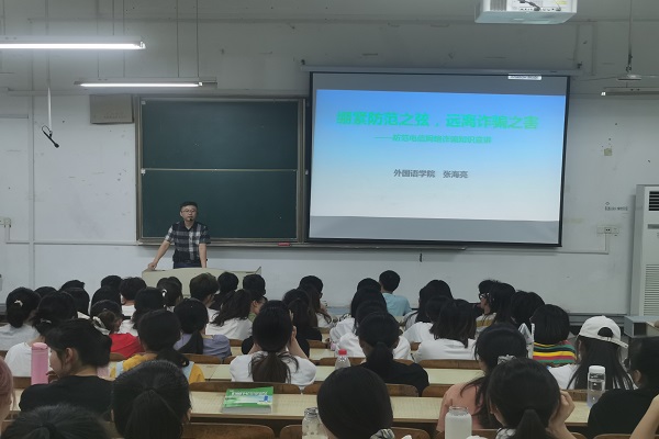 为切实增强大学生的安全意识,提高对电信诈骗手法的识别和防范能力,确保学生夏季安全,6月8日晚外国语学院在求知楼A102教室举行了防范电信网络诈骗暨夏季安全知识讲座,外国语学院党委副书记张海亮担任主讲,20级全体学生参与聆听。