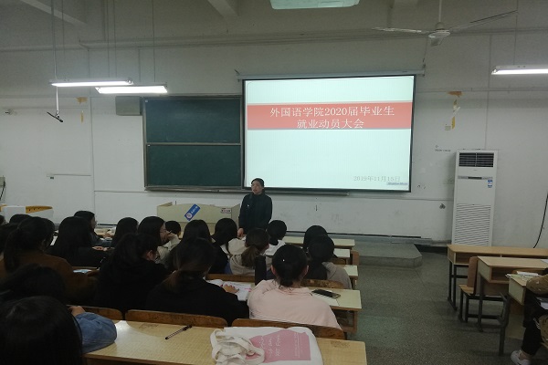 11月18日晚上19:00,外国语学院2020届毕业生就业动员大会在求A204教室举行。学院党总支书记蔡为青、就业联系人陈慧中和2016级全体学生参加会议,会议由陈慧中主持。