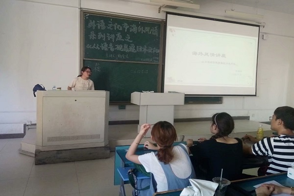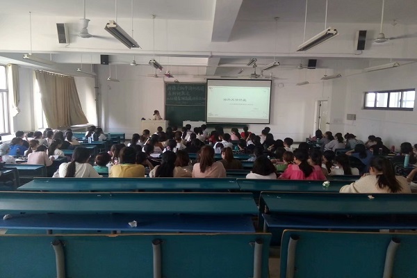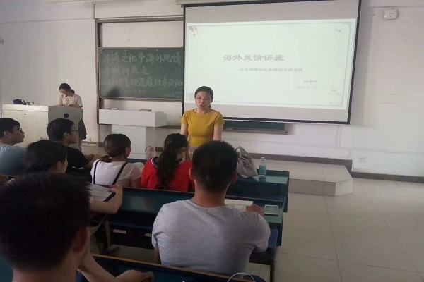 5月15日下午16:30,外国语学院在新B303教室举办“迈达斯杯”37266威尼斯官网第十届外语文化节之海外风情系列讲座—从语言现象管窥日本文化,特别邀请了外国语学院英语教研室的杨金洁老师担任主讲,本次讲座由外国语学院党总支书记蔡为青主持,学院全体17级学生聆听讲座。