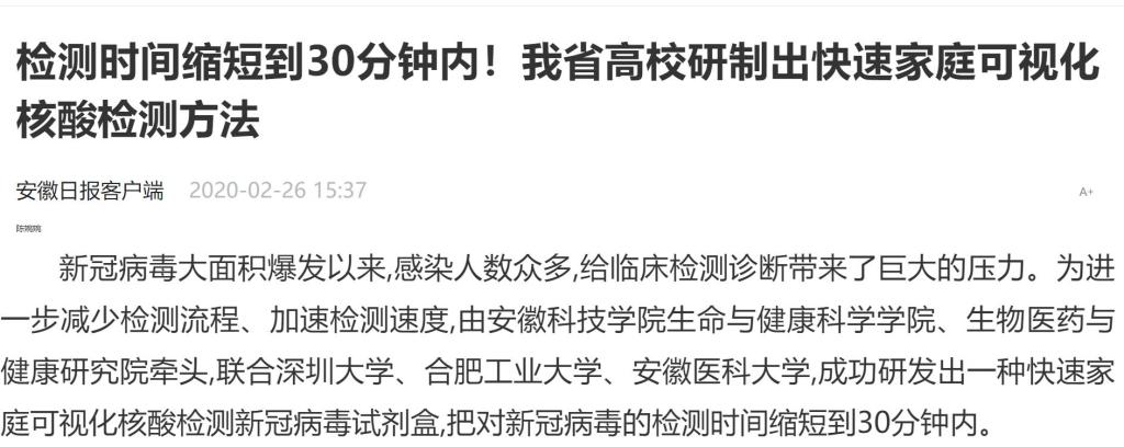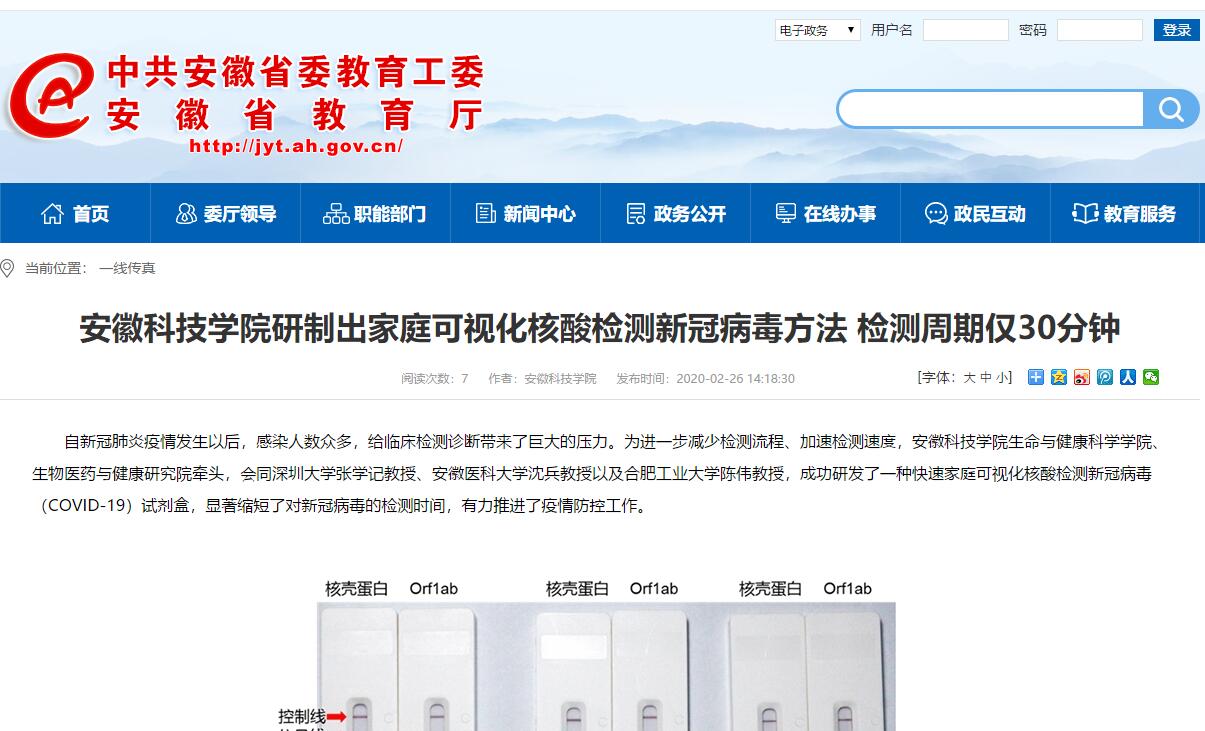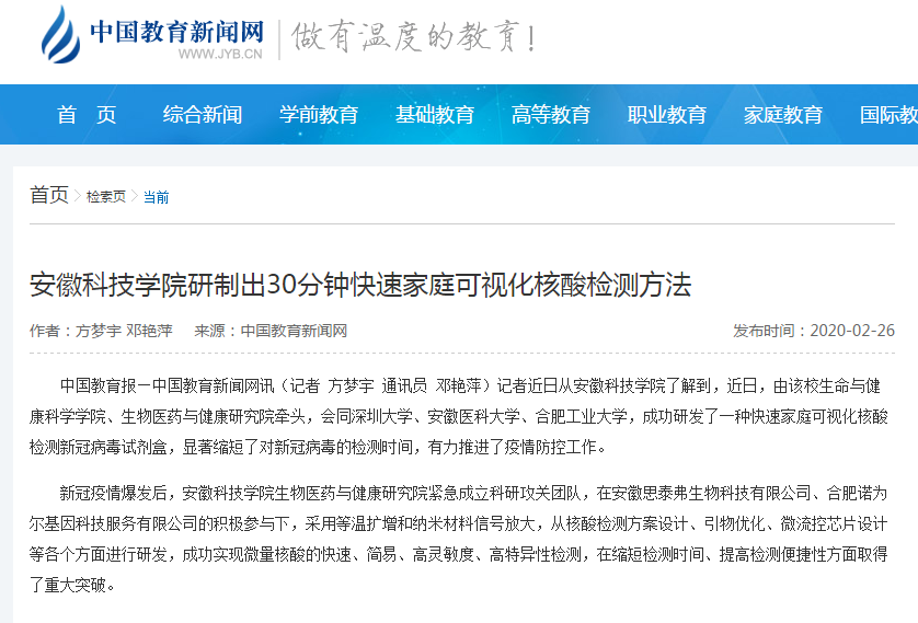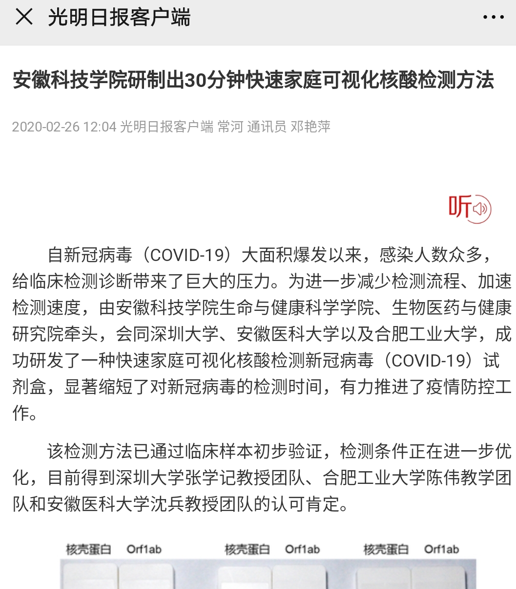 新冠肺炎疫情发生以后,威尼斯官网党委高度重视,不忘教育科研初心,秉承高度的社会责任感和使命感,指导生命与健康科学学院牵头紧急成立科研攻关团队,会同深圳大学张学记教授、安徽医科大学沈兵教授以及合肥工业大学陈伟教授,成功研发了一种快速家庭可视化核酸检测新冠病毒试剂盒,显著缩短了对新冠病毒的检测时间,受到了光明日报、安徽日报客户端,中国教育报-中国新闻网,安徽教育网,中国高校之窗等媒体关注。相关报道请点击下方图片查看。
